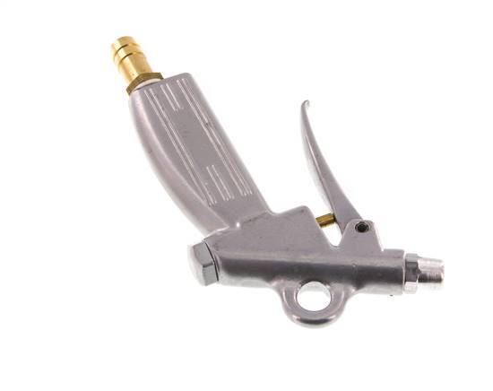 This is an aluminum compressed air blow gun with a 13 mm hose barb inlet port. The blow gun is equipped with an aluminum nozzle with a sintered brass muffler. The nozzle is screwed in a female M12x1.25 threaded outlet port.