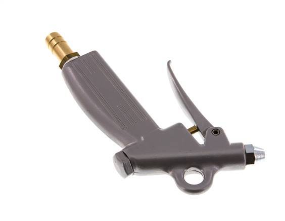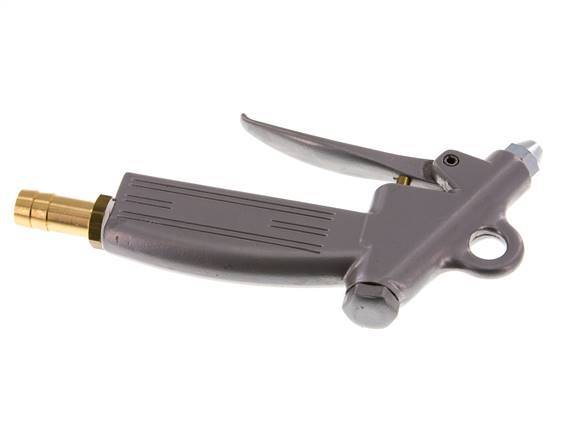 This is an aluminum compressed air blow gun with a 13 mm hose barb inlet port. The blow gun is equipped with a zinc-plated steel short nozzle. It has a 1.5 mm bore. The nozzle is screwed in a female M12x1.25 threaded outlet port.