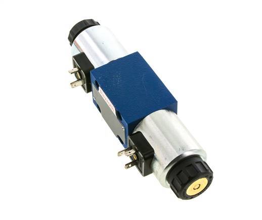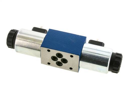 Bosch Rexroth direct operating 4/2 way hydraulic solenoid vave with NG6 (D03) mounting interface (the mounting interface NG 6 is standardised according to DIN 24340-A6, ISO 4401-03, CETOP R 35 H-03 and NFPA-D03) and a 24 V DC coil. The valve has a cast iron housing with NBR (nitrile rubber) sealing.There is no initial position. A detent mechanism can be added to either side, locking that side and making it the intial position. The valve is suitable for systems with a max pressure of 350 bar (5075 Psi) and a operating temperature range of -15 - 80 ° C (5 - 176 ° F). The valve has a flow rate of 80 l/min and a maximum allowable viscosity of 400 cSt. The NBR (nitrile rubber) sealing is suited for mineral oils. Manual override feature can be used to operate the system during power failure. The manual override can be operated up to 5-10 bar. This solenoid valve has a detent mechanism. During operation, the permanent current supply to the electromagnet can be removed because the valve is kept in position with the detent, this contributes to energy-efficient operation. Since the valve has a maximum operational pressure of 350 bar (5075 psi), it can be used for high pressure applications. The valve has an IP65 rating.