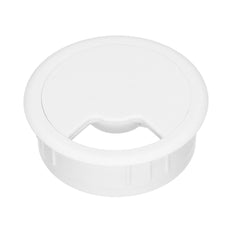 Simple and practical cable management solution for organizing desk wiring. This 60mm diameter white plastic grommet installs into a desk surface to neatly route cables from connected equipment. Includes mounting flange and requires a 60mm hole saw for installation.