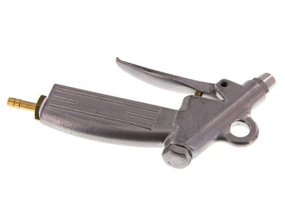 This is an aluminum compressed air blow gun with a 6 mm hose barb inlet port. The blow gun is equipped with an aluminum nozzle with a sintered brass muffler. The nozzle is screwed in a female M12x1.25 threaded outlet port.