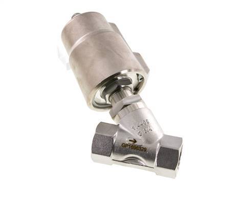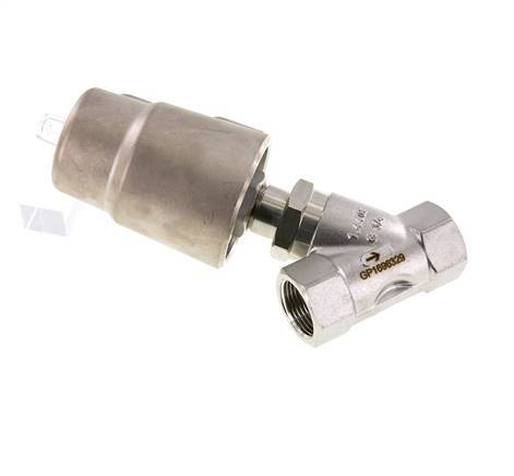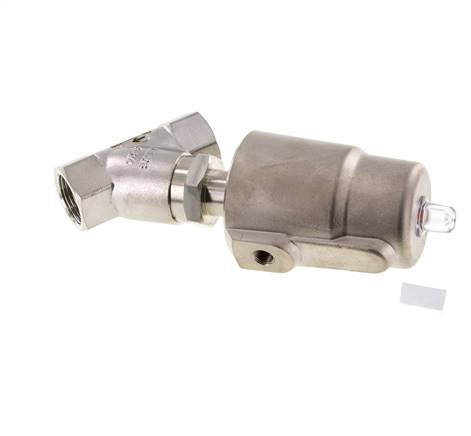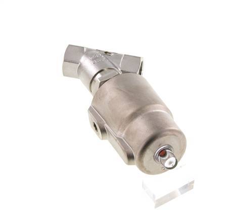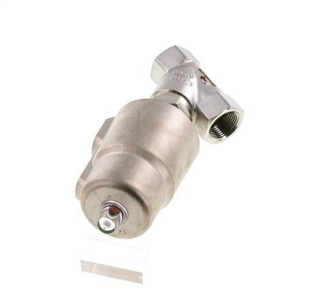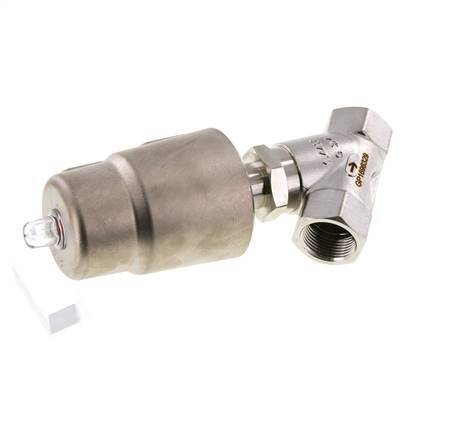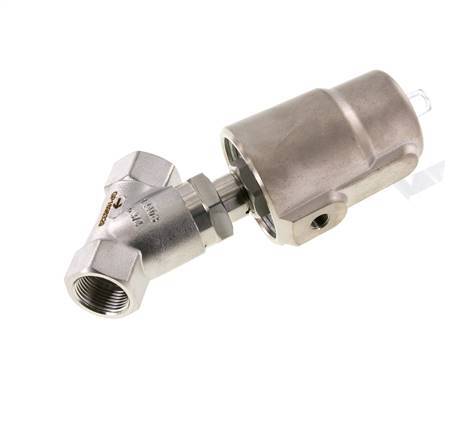 This stainless steel normally closed G 3/4" angle seat piston valve provides reliable shut-off control for gases and fluids. The seat and spindle seal is PTFE. Suited from 0 to 20 bar and temperatures from -40 up to 200°C. The valve operates with compressed air of preferably 6 bars. Excellent flow rate thanks to the Y-shaped design. Tip: for fast liquid flows, select ‘closing against flow’ valves to prevent water hammer.