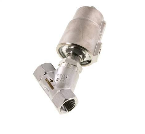 This normally closed G 3/4" angle seat piston valve provides reliable shut-off control for gases and fluids. The main valve body is made of stainless steel with a seat and spindle seal of PTFE. Suited for media from 0 to 20 bar and temperatures from -40 up to 200°C. The valve operates with compressed air of preferably 6 bars (min 4, max 10), a pneumatic 3/2 valve is required to control the air supply. Excellent flow rate thanks to the Y-shaped design. Tip: for fast liquid flows, please select 'closing against flow' valves to prevent the risk of water hammer.
