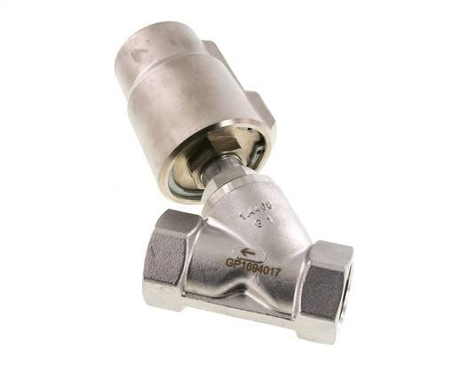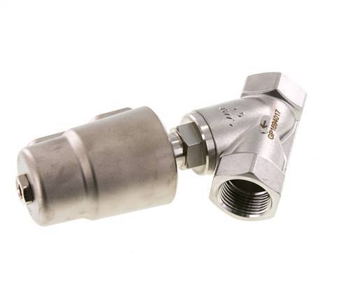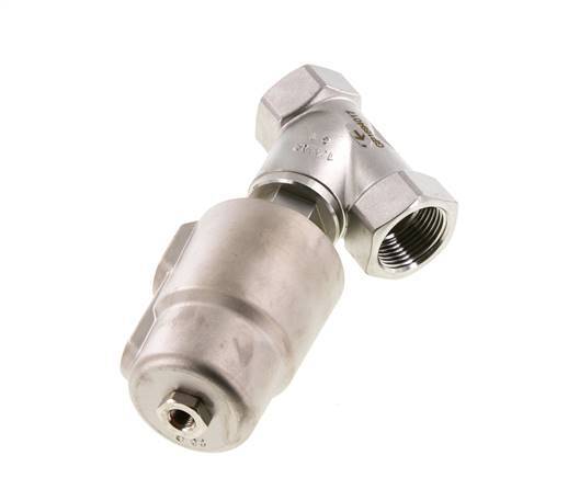 This stainless steel normally open G 1" angle seat piston valve provides reliable shut-off control for gases and fluids. The seat and spindle seal is PTFE. Suited from 0 to 16 bar and temperatures from -20 up to 200°C. The valve operates with compressed air of preferably 6 bars. Excellent flow rate thanks to the Y-shaped design. Tip: for fast liquid flows, select ‘closing against flow’ valves to prevent water hammer.