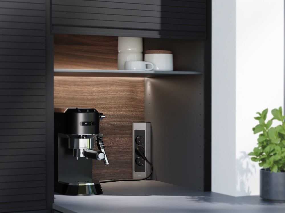 Compact corner-mounted power unit designed for kitchen environments, featuring three 230V outlets angled at 35 degrees. The unit comes with a 2-meter cable with mounting plug and can be installed both vertically and horizontally. Features an anti-fingerprint coating and stainless steel finish. Red Dot Design Award winner 2023 for its sleek and practical design.
