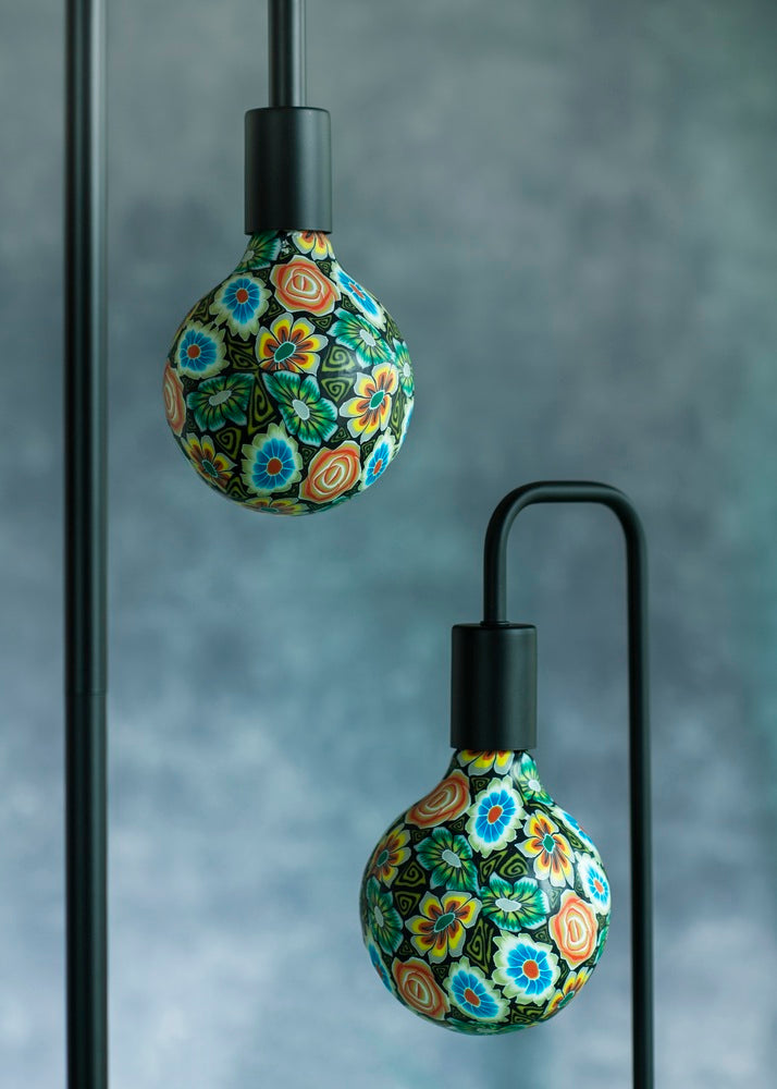 Artistic LED filament globe lamp featuring a painted glass surface with a dark flower design. This E27 retrofit bulb produces 100 lumens at 1900K, operating at 230-240V with 360° light distribution. The 125x175mm decorative bulb combines energy efficiency with contemporary aesthetics, creating a visual statement whether illuminated or not.