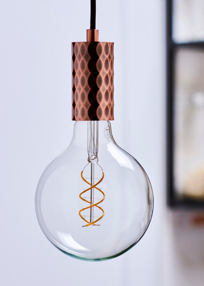 Premium LED filament globe lamp offering the classic Spiraled aesthetics at a more accessible price point. Features 300 lumens brightness, equivalent to 28W traditional bulb, with warm 2200K light output. Compatible with recommended dimmers including Bailey Wonderwall. Energy-efficient design with 320° beam angle and clear glass finish.