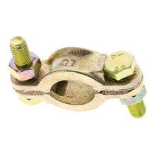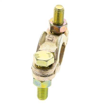 Hose clamp for compressor claw couplings (DIN 20039A). Made from malleable cast iron. Suitable for a hose diameter between 17-22 mm. The hose clamp exist out of two parts that are clamped around the hose with two bolts. These hose clamps are designed to use together with compressor claw couplings.