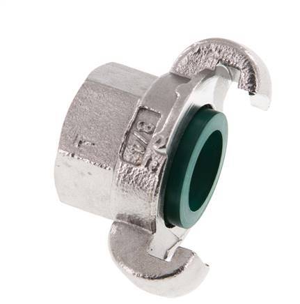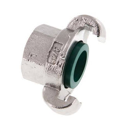 This stainless steel DIN 3489 (similar) compressor claw coupling (42mm distance between claws) has Rp 3/4 inch female threads. It is very similar to DIN 3489 and is typically connected to a compressor coupling adhering to DIN 3238 for added security from accidental de-coupling. It has threads to connect it to a hose or fitting. It has a DN of 20 mm. Each coupling has two claws at 180 degrees and is typically connected to another claw coupling. To connect, a force pushing them together is required and then the claws are spun to be 45 degrees apart to secure the connection and make a seal. It is suitable up to 16 bar within a temperature range of -40 to 95 °C. It has a Fluor caoutchouc (FPM/FKM) seal. This compressor coupling is typically used for demanding environments and larger air flows, while still having a quick connection method with a tight seal.