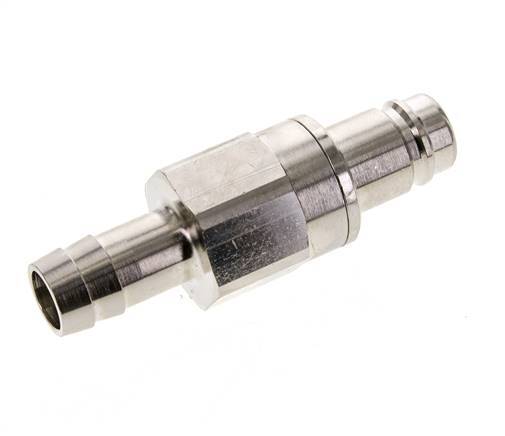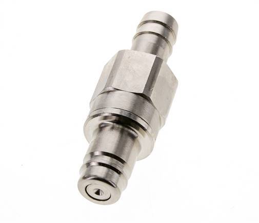 Easily mount a hose over the 19 mm hose pillar. Optionally, order a hose clamp for proper fixation of the hose. This coupling is suitable for vacuum applications. The plug has a double sided shut-off design. When the plug is disconnected, it shuts off flow in both directions. Please note that these plugs only operate with special double sided shut-off sockets! These sockets have an extra pin to open the valve in the plug when connected. The operating pressure range is 0 to 35 bar. The plug is suitable for temperatures between -20 to 100°C. The rated flow rate is 5000 l/min. The seal material is NBR (nitrile rubber). The Nickel-plated brass housing has a nickel-plated surface protection.