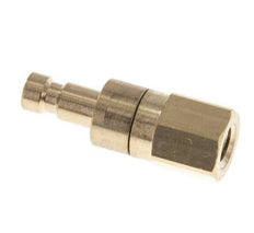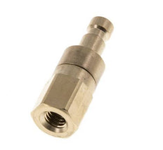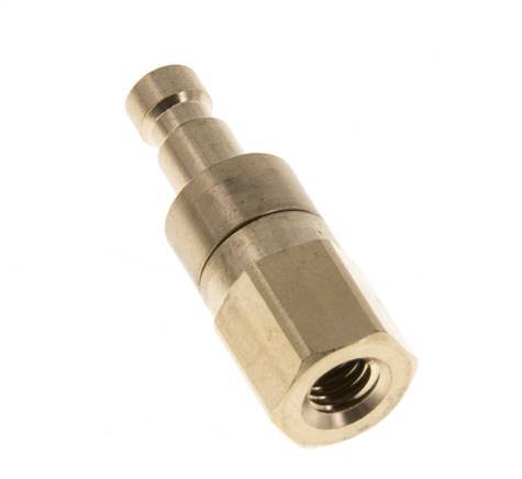 Brass DN 2.7 (micro) air coupling plug with M5 female threads. A pneumatic coupling is used to quickly connect air tools to a compressed air line. The coupling requires two parts: the socket (female) and the plug or nipple (male part). When disconnected, the coupling automatically shuts off to maintain the line pressure.