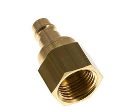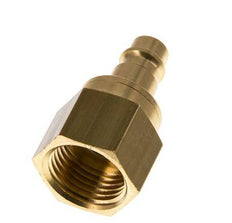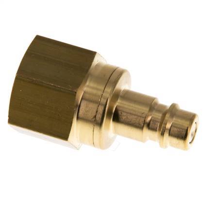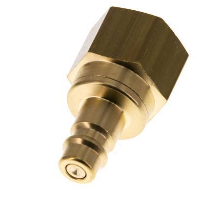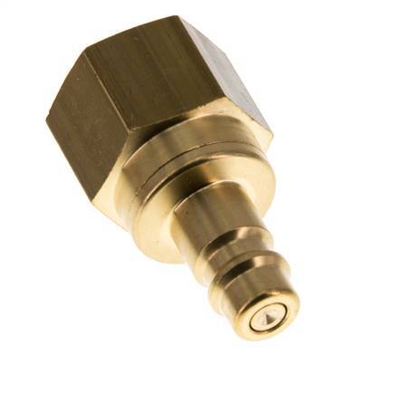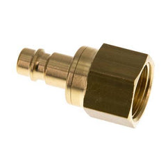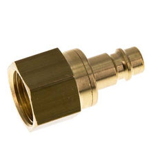 Brass DN 7.2 (Euro) air coupling plug with G 1/2 inch female threads. A pneumatic coupling is used to quickly connect air tools to a compressed air line. The coupling requires two parts: the socket (female) and the plug or nipple (male part). When disconnected, the coupling automatically shuts off to maintain the line pressure.