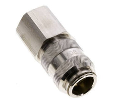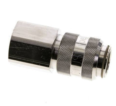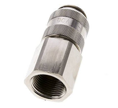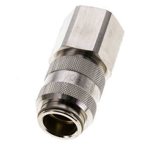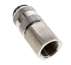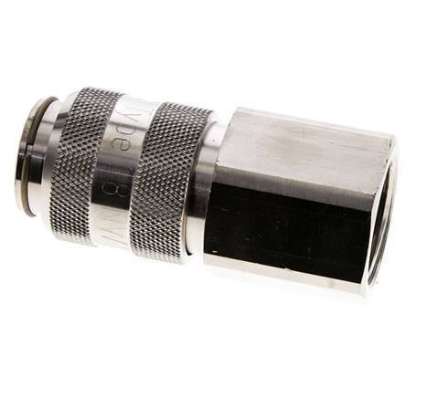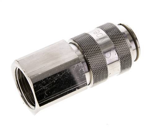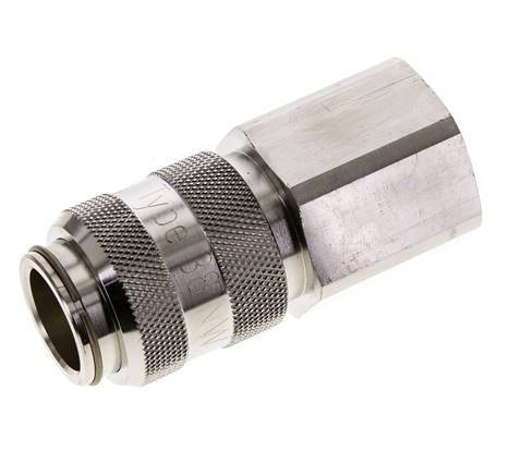 The G 1 inch female threads allow for it to be threaded onto a matching male threaded part. This coupling is suitable for vacuum applications. The socket has a double sided shut-off design. They can be used with normal plugs and with 'double-sided shut off' plugs. When double-sided shut off plugs are disconnected, they shut off flow in both directions. The operating pressure range is 0 to 35 bar. The socket is suitable for temperatures between -20 to 100°C. The rated flow rate is 5000 l/min. The seal material is NBR (nitrile rubber). The Nickel-plated brass housing has a nickel-plated surface protection.