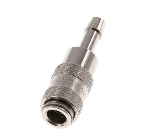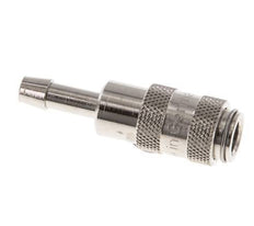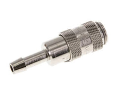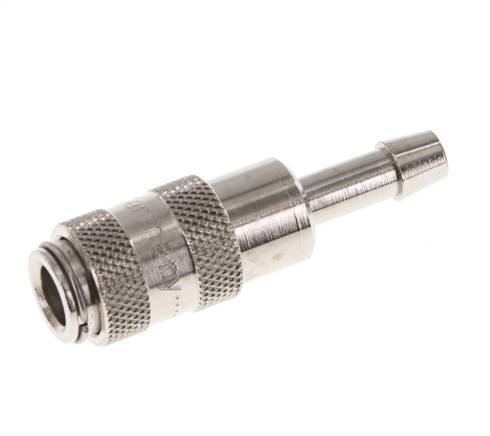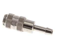Easily mount a hose over the 4 mm hose pillar. Optionally, order a hose clamp for proper fixation of the hose. This coupling is suitable for vacuum applications. The operating pressure range is -0.95 to 35 bar. The socket is suitable for temperatures between -20 to 100°C. The rated flow rate is 165 l/min. The seal material is NBR (nitrile rubber). The Nickel-plated brass housing has a nickel-plated surface protection.