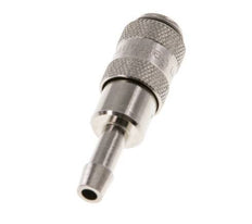 Nickel-plated brass DN 2.7 (micro) air coupling socket with a 4 mm hose pillar connection. A pneumatic coupling is used to quickly connect air tools to a compressed air line. The coupling requires two parts: the socket (female) and the plug or nipple (male part). When disconnected, the coupling automatically shuts off to maintain the line pressure.