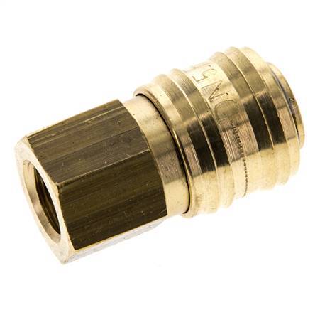 Brass DN 5.5 (Orion) air coupling socket with G 1/4 inch female threads. A pneumatic coupling is used to quickly connect air tools to a compressed air line. The coupling requires two parts: the socket (female) and the plug or nipple (male part). When disconnected, the coupling automatically shuts off to maintain the line pressure.