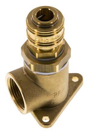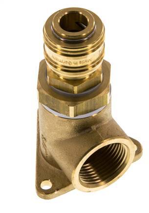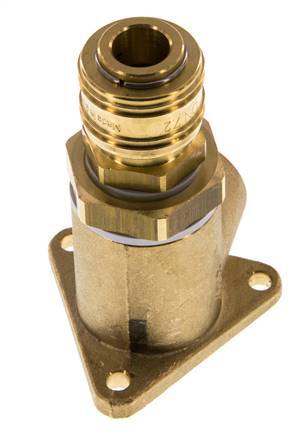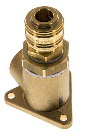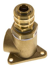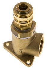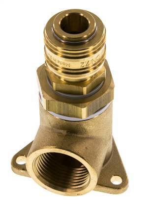 Brass DN 7.2 (Euro) air coupling socket with G 3/4 inch female threads. Wall mount design. The operating pressure range is 0 (suitable for coarse vacuums) to 35 bar. The socket is suitable for temperatures between -20 to 100°C. The seal material is NBR (nitrile rubber).
