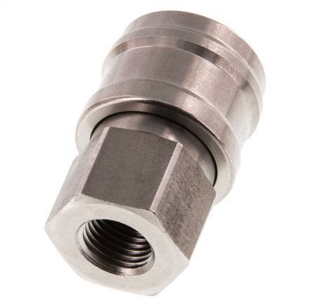 The G 1/4 inch female threads allow for it to be threaded onto a matching male threaded part. This coupling is suitable for vacuum applications. The socket has a double sided shut-off design. They can be used with normal plugs and with 'double-sided shut off' plugs. When double-sided shut off plugs are disconnected, they shut off flow in both directions. The operating pressure range is -0.95 to 35 bar. The socket is suitable for temperatures between -15 to 200°C. The rated flow rate is 800 l/min. The seal material is FPM/FKM. The housing material is stainless steel 303 (1.4305). This DN 7.2 mm has a Euro profile and is popular within Europe.
