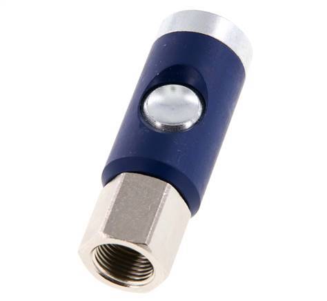 Hardened steel DN 7.4 safety air coupling socket with G 3/8 inch female threads. These safety couplings release the down-line air pressure by pushing the button on the socket. We recommend to use hardened steel nipples for safety couplings. The operating pressure range is 0 to 12 bar. The socket is suitable for temperatures between -20 to 70°C. The flow rate is 1500 l/min. The seal material is NBR (nitrile rubber).