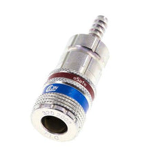 These safety couplings release the down-line air pressure at the plug side in a safe, controlled manner by pulling the sleeve on the socket. The plug will not be released before the pressure at the plug side reaches a safe low level. This prevents the risk of a dangerous bull whip effect which may cause damage to man and machine. We recommend to use hardened steel plugs with these couplings. Easily mount a hose over the 6 mm hose pillar. Optionally, order a hose clamp for proper fixation of the hose. The operating pressure range is 0 to 16 bar. The socket is suitable for temperatures between -20 to 80°C. The rated flow rate is 2250 l/min. The seal material is NBR (nitrile rubber). The steel/brass housing has a galvanic/electrolytic zinc plated surface protection. This DN 7.6 mm has a Euro profile and is popular within Europe.