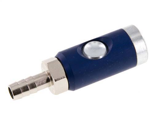 Hardened steel DN 7.4 safety air coupling socket with a 10 mm hose pillar connection. These safety couplings release the down-line air pressure by pushing the button on the socket. We recommend to use hardened steel nipples for safety couplings. The operating pressure range is 0 to 12 bar. The socket is suitable for temperatures between -20 to 70°C. The flow rate is 1500 l/min. The seal material is NBR (nitrile rubber).