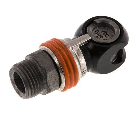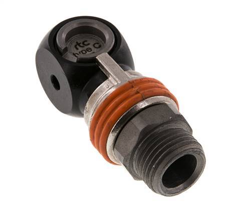 Steel DN 8 safety air coupling socket with G 1/2 inch male threads. A pneumatic coupling is used to quickly connect air tools to a compressed air line. The coupling requires two parts: the socket (female) and the plug or nipple (male part). When disconnected, the coupling automatically shuts off to maintain the line pressure.
