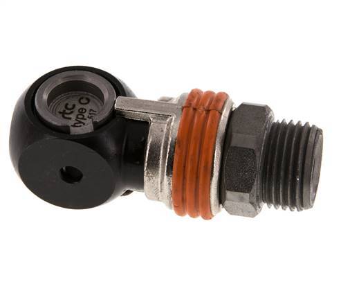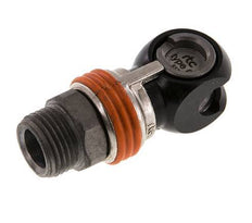 These safety couplings release the down-line air pressure at the plug side in a safe, controlled manner by a manual swivel action on the socket. The plug will not be released before the pressure at the plug side reaches a safe low level. This prevents the risk of a dangerous bull whip effect which may cause damage to man and machine. We recommend to use hardened steel plugs with these couplings. The G 1/2 inch male threads allow for it to be threaded onto a matching female threaded part. This coupling is suitable for vacuum applications. The operating pressure range is 0 to 25 bar. The socket is suitable for temperatures between -20 to 100°C. The rated flow rate is 1800 l/min. The seal material is NBR (nitrile rubber). The steel housing has a nickel-plated surface protection.