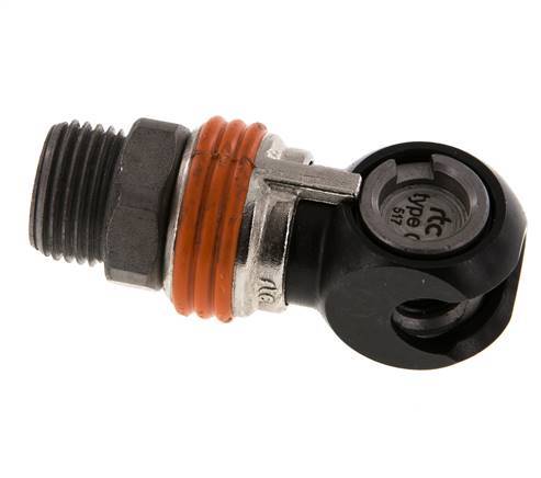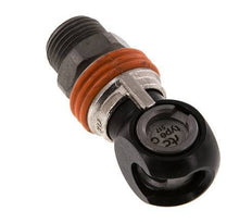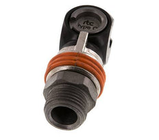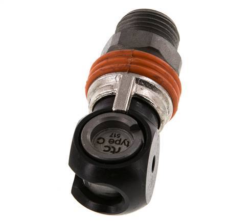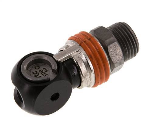 Steel DN 8 safety air coupling socket with G 1/2 inch male threads. These safety couplings release the down-line air pressure by a manual swivel action on the socket. We recommend to use hardened steel nipples for safety couplings. The operating pressure range is 0 (suitable for coarse vacuums) to 25 bar. The socket is suitable for temperatures between -20 to 100°C. The flow rate is 1800 l/min. The seal material is NBR (nitrile rubber).