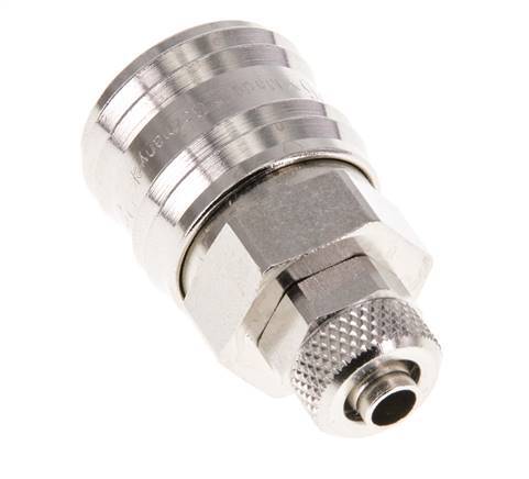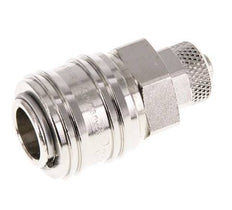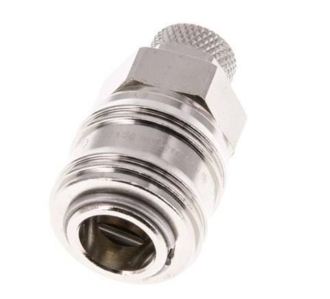 This coupling is suitable for vacuum applications. The socket has a double sided shut-off design. They can be used with normal plugs and with 'double-sided shut off' plugs. When double-sided shut off plugs are disconnected, they shut off flow in both directions. The operating pressure range is -0.95 to 35 bar. The socket is suitable for temperatures between -20 to 100°C. The rated flow rate is 800 l/min. The seal material is NBR (nitrile rubber). The Nickel-plated brass housing has a nickel-plated surface protection. This DN 7.2 mm has a Euro profile and is popular within Europe.