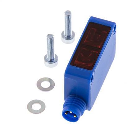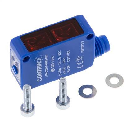 This diffuse-reflective photoelectric sensor has a transmitter and receiver integrated within the same housing. The detection range is from 3 to 1500 mm and the maximum switching distance is the 1300 mm. It has an M8 connector with 3-pin. Switching mode: PIN 4 - light-switching. The operating voltage 10 - 30 V DC and the control output 100mA (PNP). The sensor is IO-Link capable.