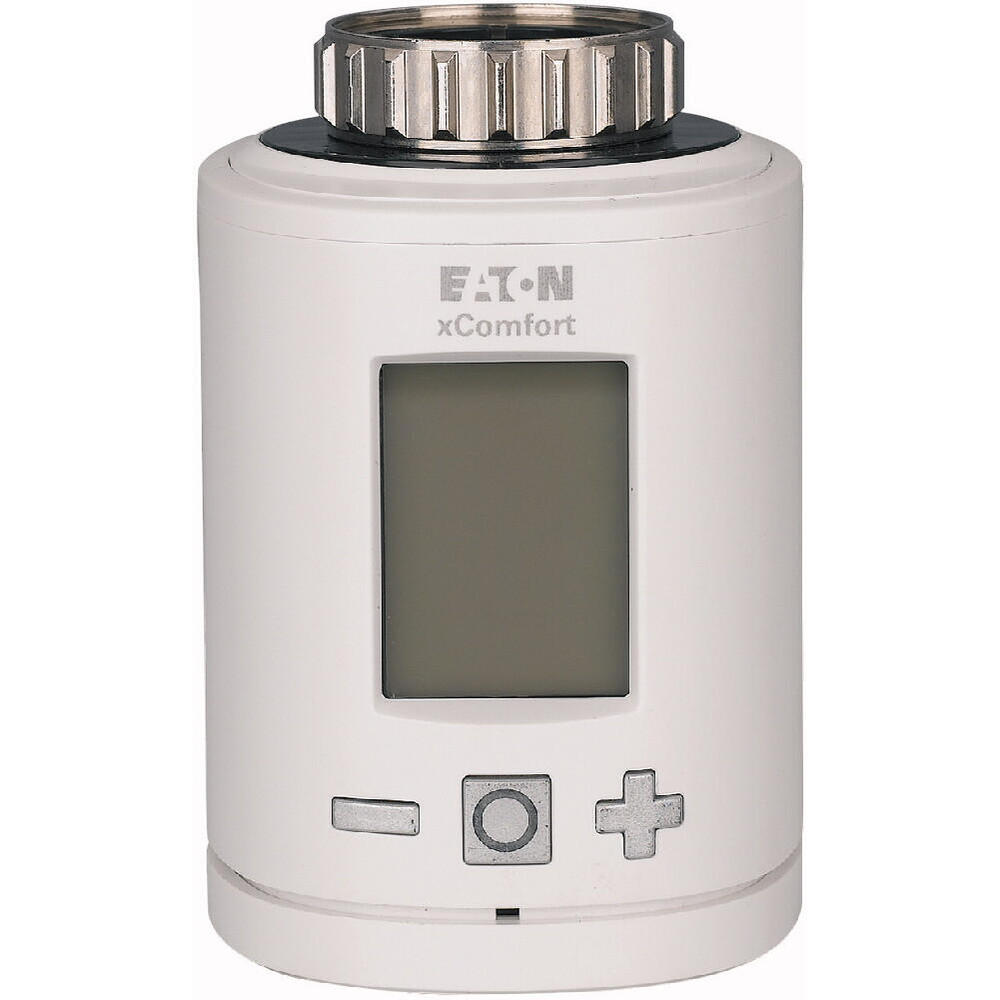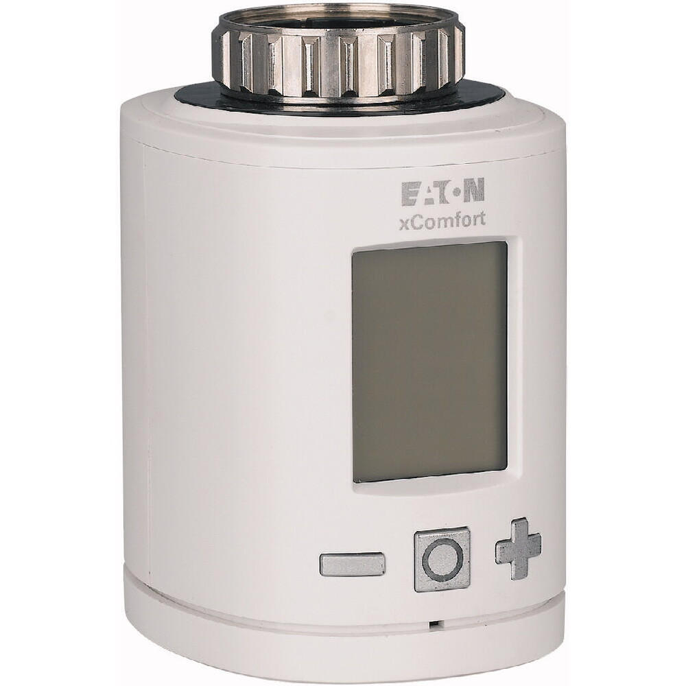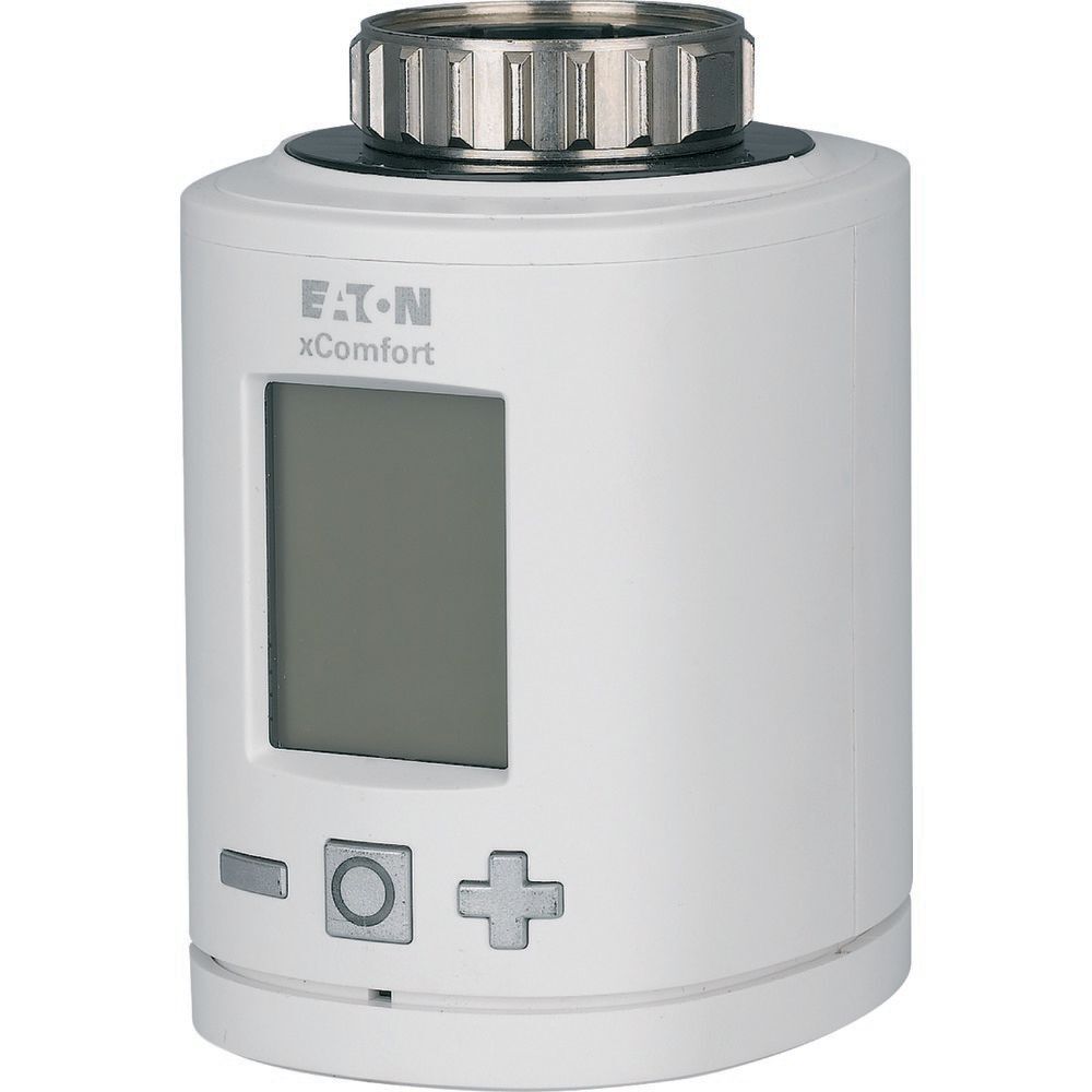 The Eaton Industries XComfort is a radiator thermostat designed for automated control of water-based radiators, compatible with RF and Powerline bus systems. It brings together the advantages of valve protection, seamless adjustment, and manual switching. The unit operates on battery power and can function either stand-alone or in synergy with the SHC Climate function for efficient zone-based climate control. This makes it not only ideal for energy conservation but also enhances comfort levels. The thermostat includes a large illuminated display with easy-to-use buttons and a child lock for added safety. Additionally, it offers hassle-free mounting and is provided with various adapters to accommodate different kinds of radiators of various brands. Its protection grade is IP20.