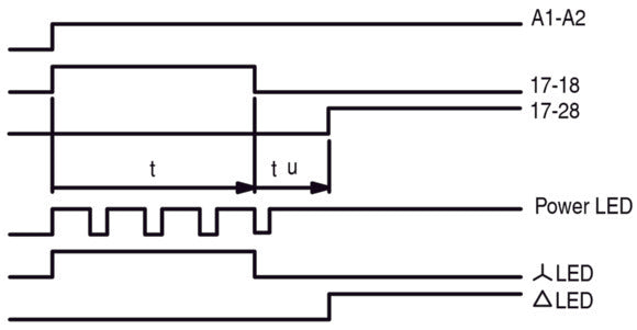 Industrial electronic timing relay designed for star-delta switching applications, featuring a 3-60 second time range and 24-240V AC/DC universal power supply. This 22.5mm wide DIN rail-mounted device complies with IEC/EN 61812-1 and VDE 0435 standards, offering a mechanical lifespan of 30 million operations. Suitable for any mounting position in industrial control systems.