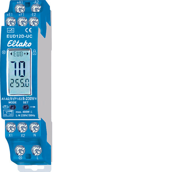 This EUD12D-UC dimmer from Eltako's EUD12 series is a universal dimmer suitable for incandescent and halogen lamps (R), wound transformers (L), electric transformers (C), dimmable energy-saving lamps (ESL) and dimmable 230V LED lamps up to 400W. By connecting an impulse switch to the dimmer, you can easily dim your lights to you your desired setting. A short control pulse turns the lights on or off. A longer pulse controls the light intensity.