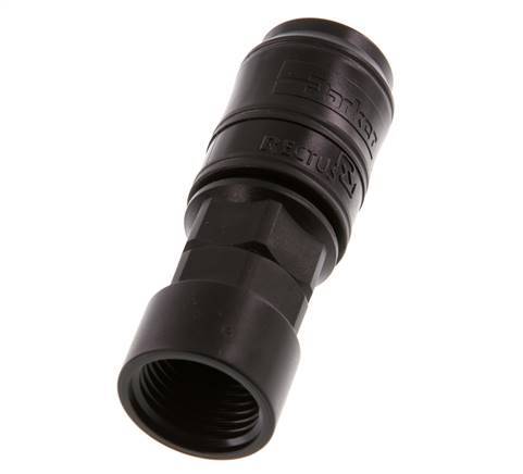 Polyoxymethylene (POM) DN 7.2 coupling socket with G 1/2 inch female threads. A pneumatic coupling is used to quickly connect air tools to a compressed air line.