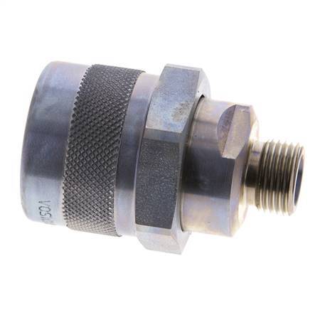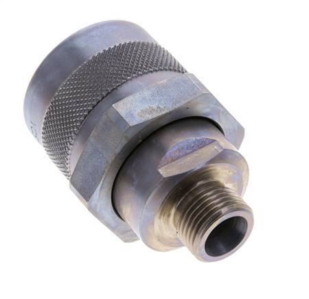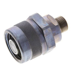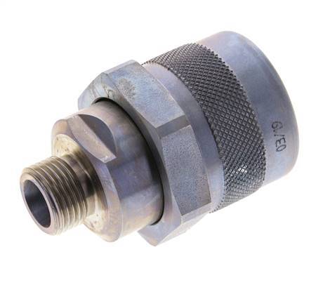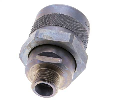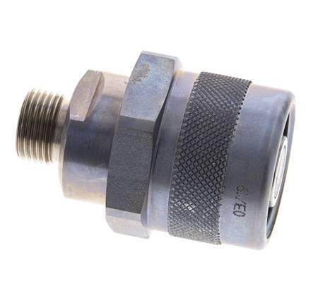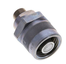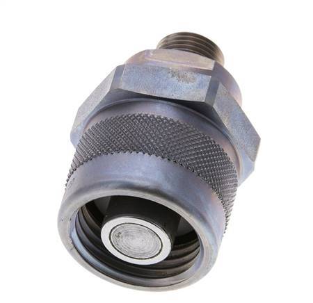 The connection of the coupling sleeve and coupling plug is carried out via a screw connection with a hand nut. It locks together when connected. When uncoupling the valves, the valves close before the coupling halves separate. Therefore an air inlet in the pipelines is prevented. The coupling and uncoupling is done almost without oil leaks. Can be coupled manually up to 20 bar under pressure (with tools even higher coupling pressures possible).