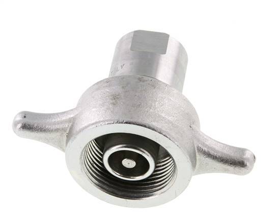 To connect, screw this quick fastener to the sleeve component and use the hand nut to tighten. A chamber is created before the plug and sleeve connect, preventing contaminants from entering. When de-coupled, the plug and sleeve are closed before exposure to prevent any loss in pressure.
