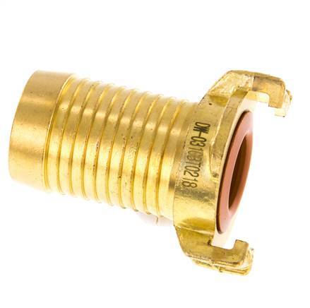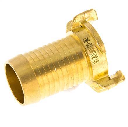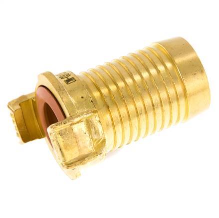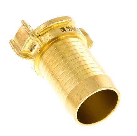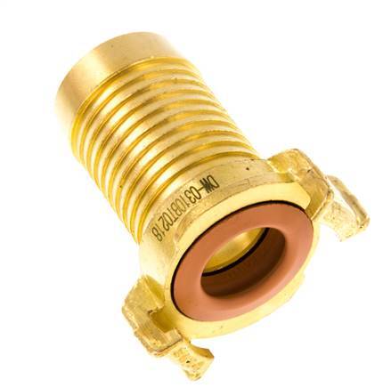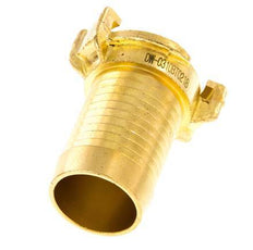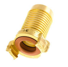 This is a garden hose coupling (also known as GEKA) with a 32 mm (1 1/4 inch) hose barb. The garden hose coupling has a symmetrical and non shut-off design with a 40 mm distance between the claws. It is made of brass with an NBR (nitrile rubber) seal. The maximum operating pressure is 25 bar (363 psi). The coupling is suitable for temperatures between 0 to 80 °C (32 to 176 °F). It has a KTW approval.