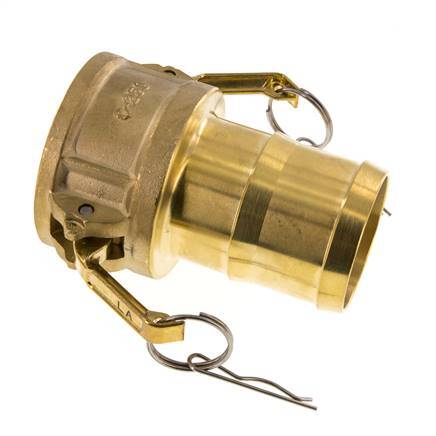 Brass DN 60 (2 1/2 inch) Camlock coupling socket with 63 mm hose pillar. This coupling is a Type C coupling (straight socket with hose barb end). The maximum operating pressure is 11 bar (160 psi). The coupling is suitable for temperatures between -10 to 80 °C (14 to 176 °F). It has an NBR (nitrile rubber) seal. The coupling adheres to the MIL-C-27487 standard.