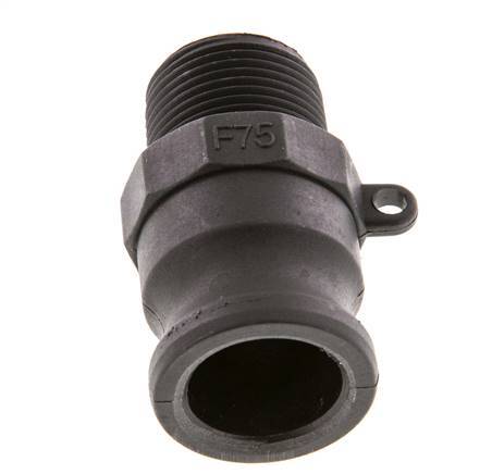 Polypropylene DN 20 (3/4 inch) Camlock coupling adapter (male) with R 3/4 inch male thread. This coupling is a Type F coupling (plug with male threaded end). The maximum operating pressure is 6 bar (87 psi). The coupling is suitable for temperatures between -10 to 80 °C (14 to 176 °F). It has an EPDM seal. The coupling adheres to the MIL-C-27487 standard.