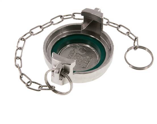This is a DN 50 tank truck cap (MB type). The MB cap is used with VK-type couplings. It is made of stainless steel with a CSM (Hypalon) seal. The maximum pressure is 16 bar (232 psi). The coupling is suitable for temperatures between -20 to 80 °C (-4 to 176 °F).