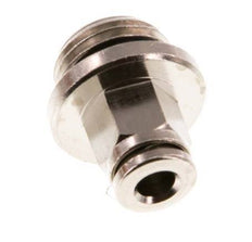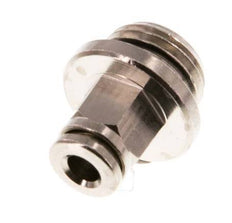 This is a 2 connection straight push-in fitting. Push-in fittings are ideal to create fast and reliable connections for pneumatic hoses. Connection 1 is a 4 mm push-in port. Connection 2 has G 1/4 inch male threads. The male thread connection has an O-ring seal. The body is made of brass. The connection ports are made of nickel plated brass. The seal material is NBR. The operating pressure range is -0.98 to 16 bar (-14 to 232 psi), making it suitable for vacuums. The fitting is suitable for temperatures from -20 to 80 °C (-4 to 176 °F).