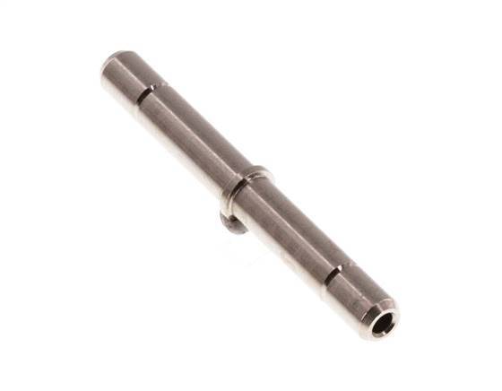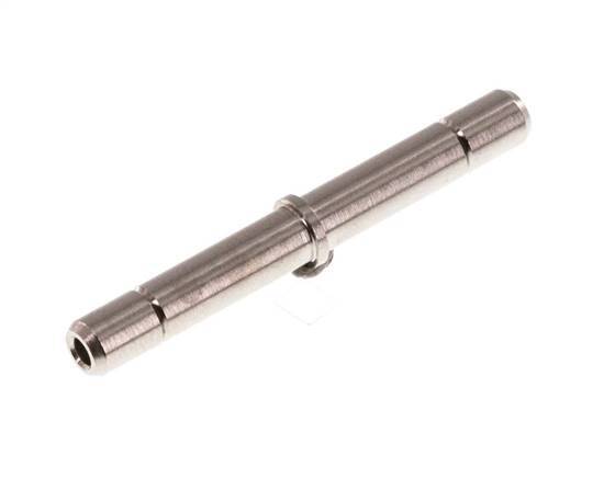 This is a plug-in connector. It has connection port to connect multiple push-in fittings together. Both plug-in connections have a 4 mm connection size. The body is made of brass. The connection ports are made of nickel plated brass. The seal material is FKM. The operating pressure range is -0.98 to 16 bar (-14 to 232 psi), making it suitable for vacuums. The fitting is suitable for temperatures from -20 to 150 °C (-4 to 302 °F).