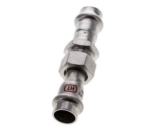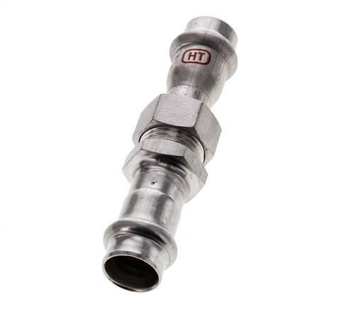 This is a union straight press fitting made from stainless steel 1.4404. The fitting has two female press ports. Connection 1 and 2 are designed for a tube with an outer diameter of 15 mm. The fitting has an FKM sealing ring. It also has a flat seal made of centellen. The maximum pressure is 40 bar (580 psi). The fitting is suitable for temperatures from -20 to 200 °C (-4 to 392 °F). Temporary, the max temperature can be +280 °C (536 °F). The fitting length is 104 mm.