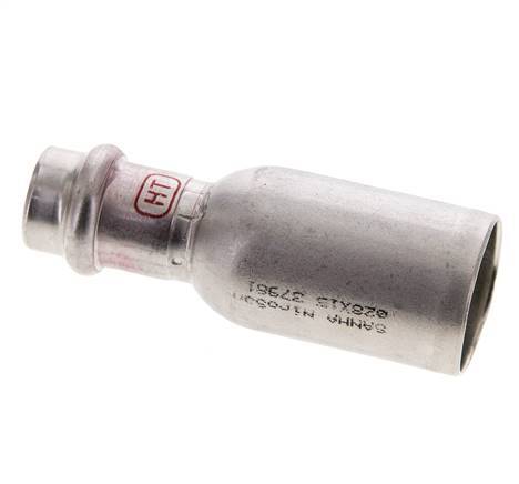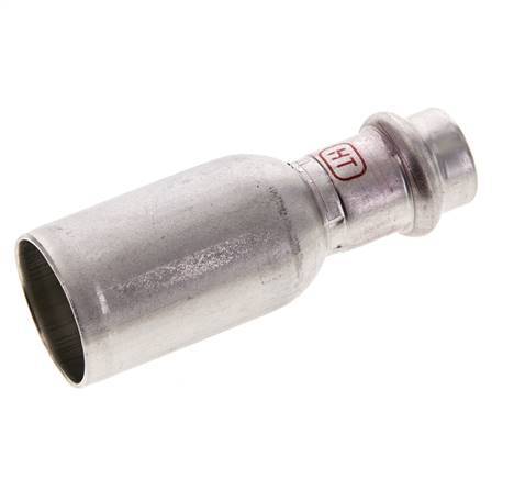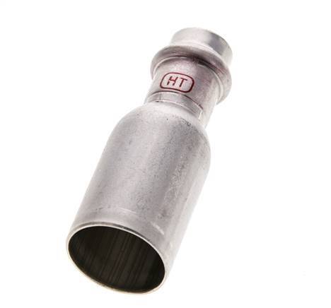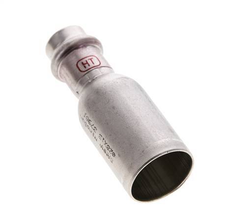 This is a reducing press fitting made from stainless steel 1.4404. The fitting has a male press (FTG) port and a female press port. Connection 1 is designed for a tube with an outer diameter of 15 mm and connection 2 has a male press connection with a 28 mm outer diameter. The fitting has an FKM sealing ring. The maximum pressure is 25 bar (363 psi). The fitting is suitable for temperatures from -20 to 200 °C (-4 to 392 °F). Temporary, the max temperature can be +280 °C (536 °F). The fitting length is 78 mm.