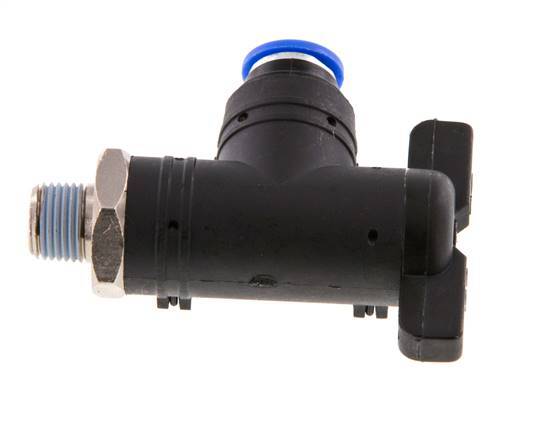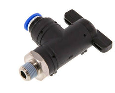 This is a nickel-plated brass/pa66/pps 2-way elbow ball valve for open/close control of the air flow. It has a 6 mm push-in fitting on one side and an R 1/8 inch male threaded port on the other side. It has NBR seals that make it suitable for applications within a temperature range from -20 to 80 °C (-4 to 176 °F). The operating pressure range is -0.95 to 20 bar (-14 to 290 psi), making it suitable for vacuums. Use the quarter-turn handle to open or close the valve.