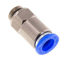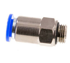 This is a nickel-plated brass / PBT auto shut-off push-in fitting. The fitting shuts off automatically when the hose is removed. It has a 10 mm push-in fitting on one side and a G 1/4 inch male threads on the other side. It has an NBR seal that makes it suitable for applications within a temperature range from 0 to 60 °C (32 to 140 °F). The operating pressure range is 0 to 10 bar (0 to 145 psi).