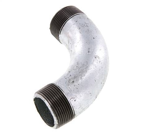 This 90-degree elbow pipe with male threads is used to connect two female threaded pipes or components. It is used in low-pressure applications up to 25 bar (351.25 psi). It is made of malleable cast iron and has a zinc coating for corrosion protection. Due to the large radius on the elbow, there is minimal pressure loss. It is suitable for steam, water, and air.