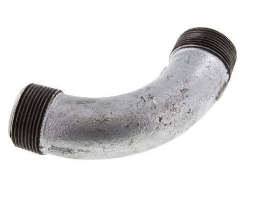 This 90-degree elbow pipe with male threads is used to connect two female threaded pipes or components. It is used in low-pressure applications up to 25 bar (351.25 psi). It is made of malleable cast iron and has a zinc coating for corrosion protection. Due to the large radius on the elbow, there is minimal pressure loss. It is suitable for steam, water, and air.
