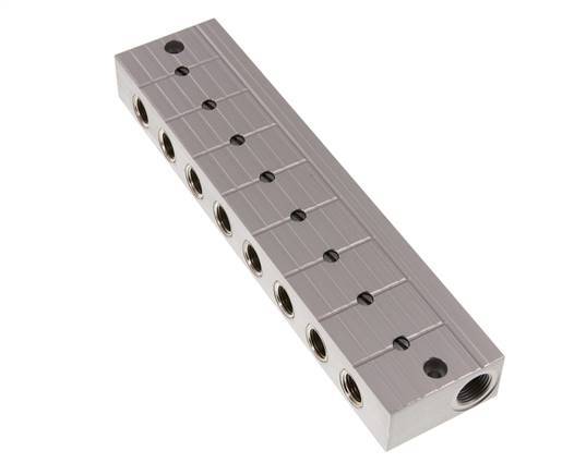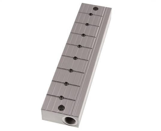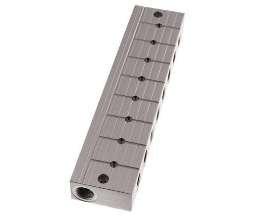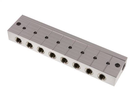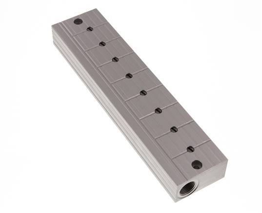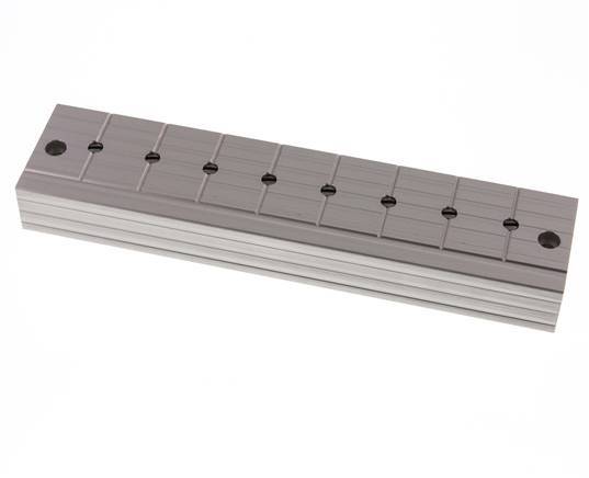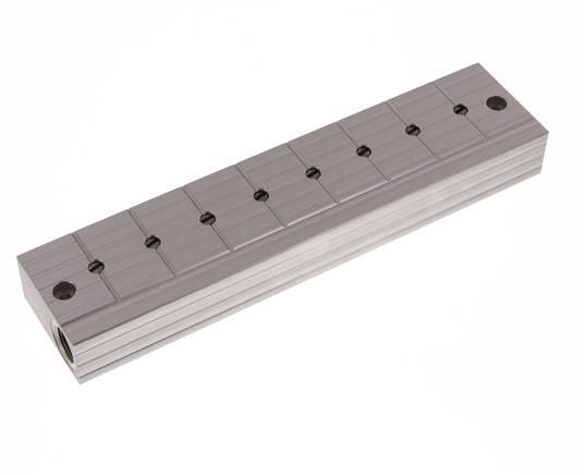This is a stainless steel distributor bar with integrated ball valves on each outlet. It has two inlet and eight outlet ports. It serves as a distributor bar and a stopper bar for systems where it becomes necessary to turn off individual control loops. At each outlet, the bar has a ball valve that can be adjusted with a screwdriver. The ball valve position is shown in the slot in the spindle.