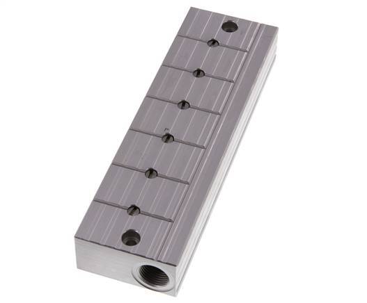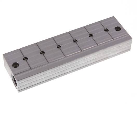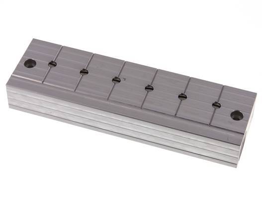 This is a stainless steel distributor bar with integrated ball valves on each outlet. It has two inlet and six outlet ports. It serves as a distributor bar and a stopper bar for systems where it becomes necessary to turn off individual control loops. At each outlet, the bar has a ball valve that can be adjusted with a screwdriver. The ball valve position is shown in the slot in the spindle.